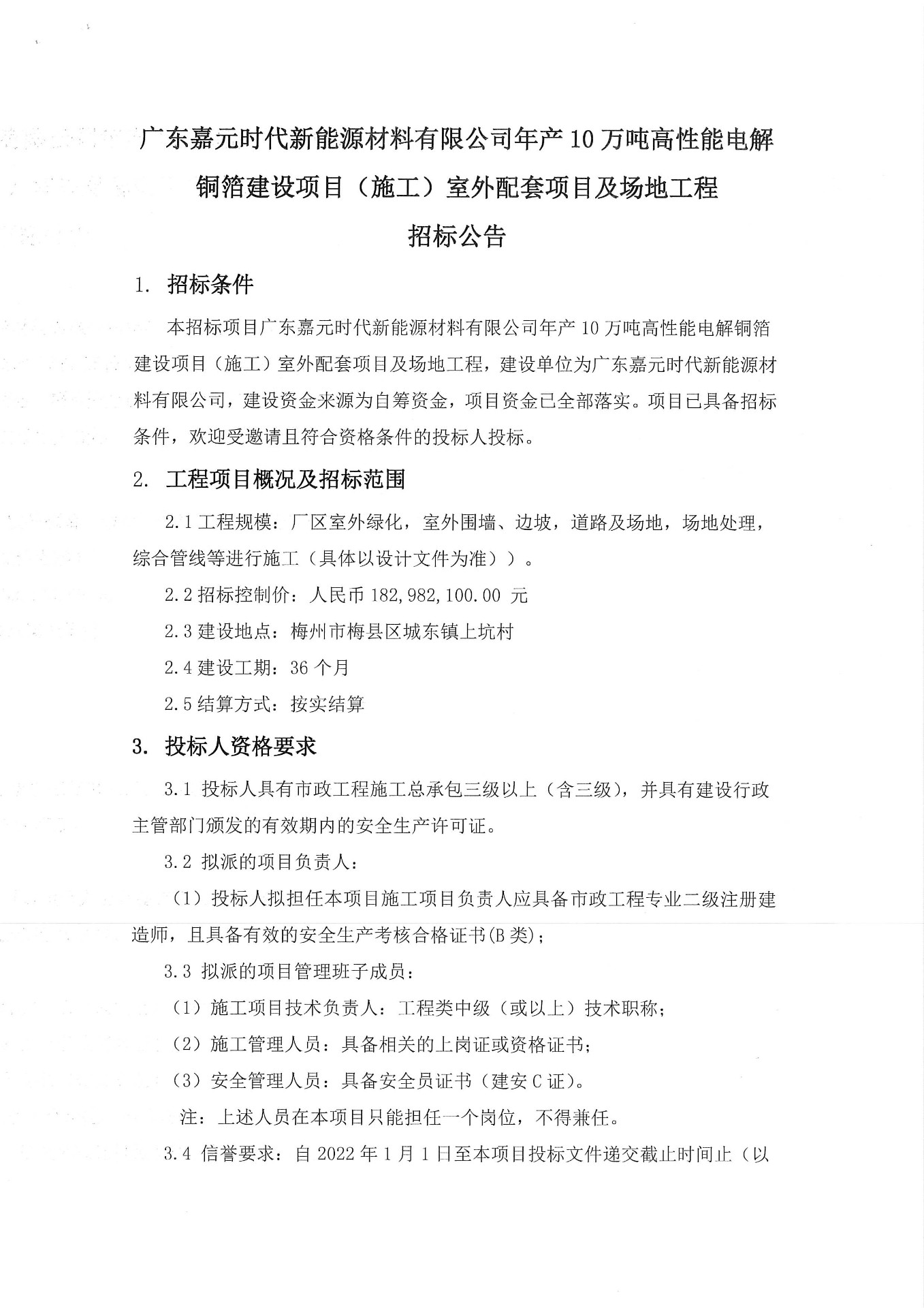 廣東嘉元時代新能源材料有限公司年產(chǎn)10萬噸高性能電解銅箔建設(shè)項目(施工)室外配套項目及場地工程招標公告