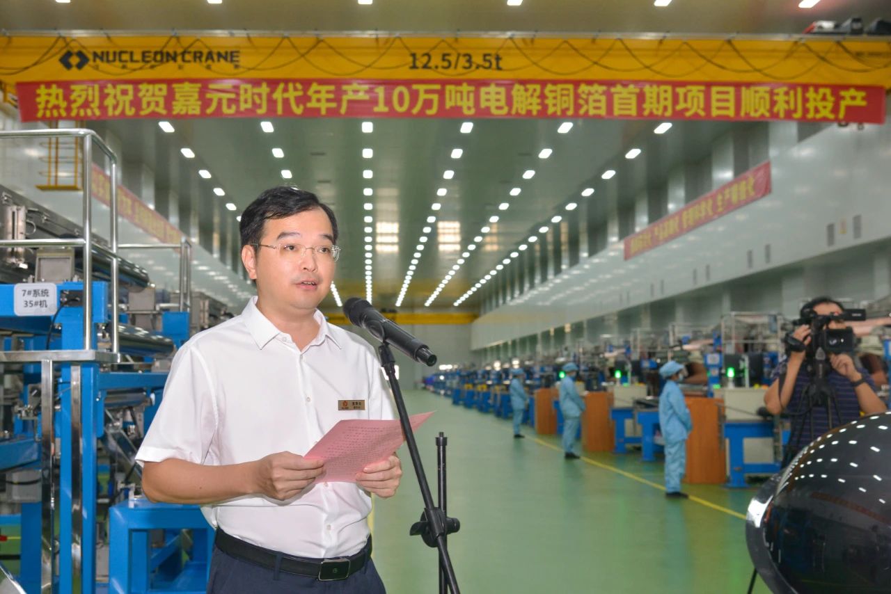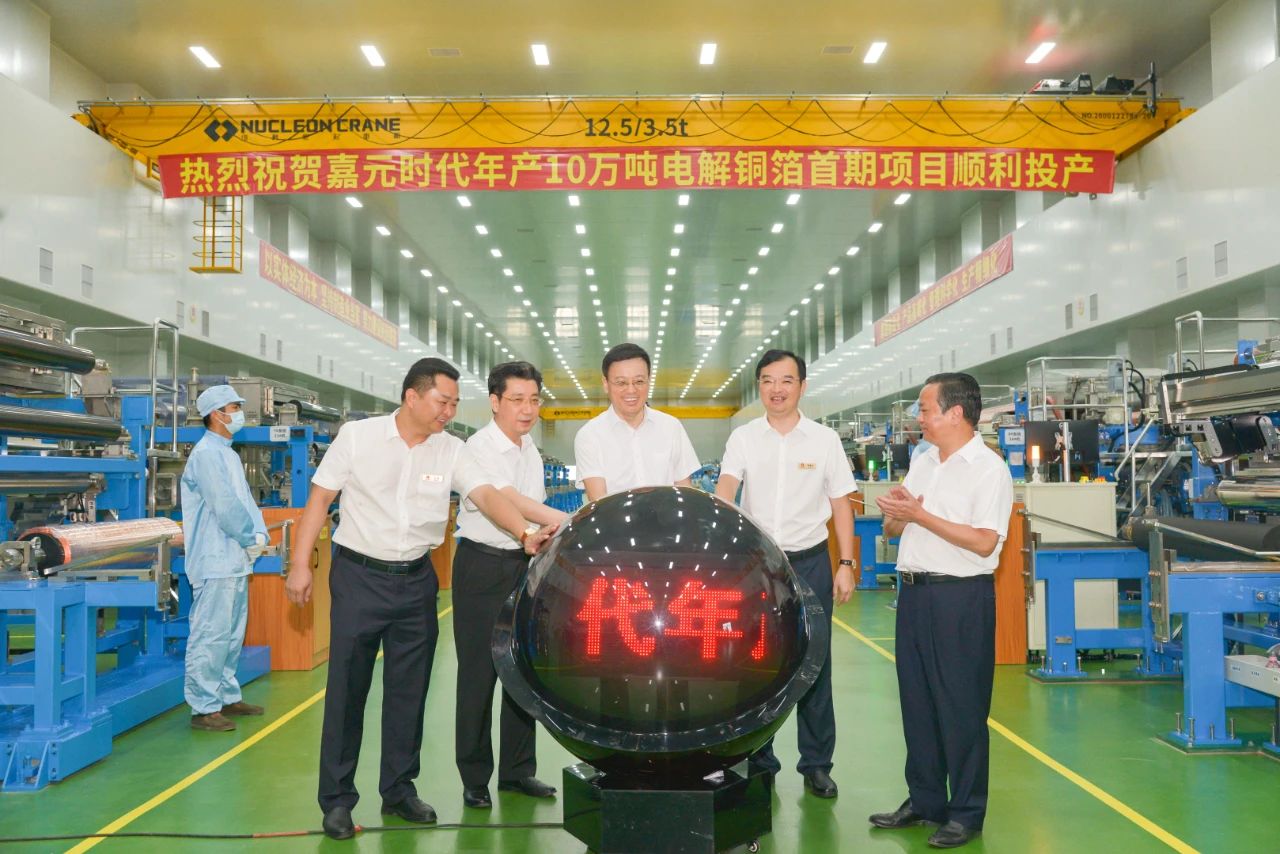 9月28日上午,嘉元時代年產(chǎn)10萬噸高性能電解銅箔首期項(xiàng)目投產(chǎn)儀式在梅縣區(qū)城東鎮(zhèn)上坑村舉行。投產(chǎn)儀式上,梅州市委書記馬正勇,市委副書記、市長王暉,梅縣區(qū)委書記溫助民,廣東嘉元科技股份有限公司董事長廖平元、總裁楊劍文共同點(diǎn)亮啟動球,3號廠房內(nèi)的生箔機(jī)隨即緩緩?fù)鲁鼋瘘S色的銅箔,標(biāo)志著嘉元時代年產(chǎn)10萬噸高性能電解銅箔首期項(xiàng)目順利投產(chǎn)。