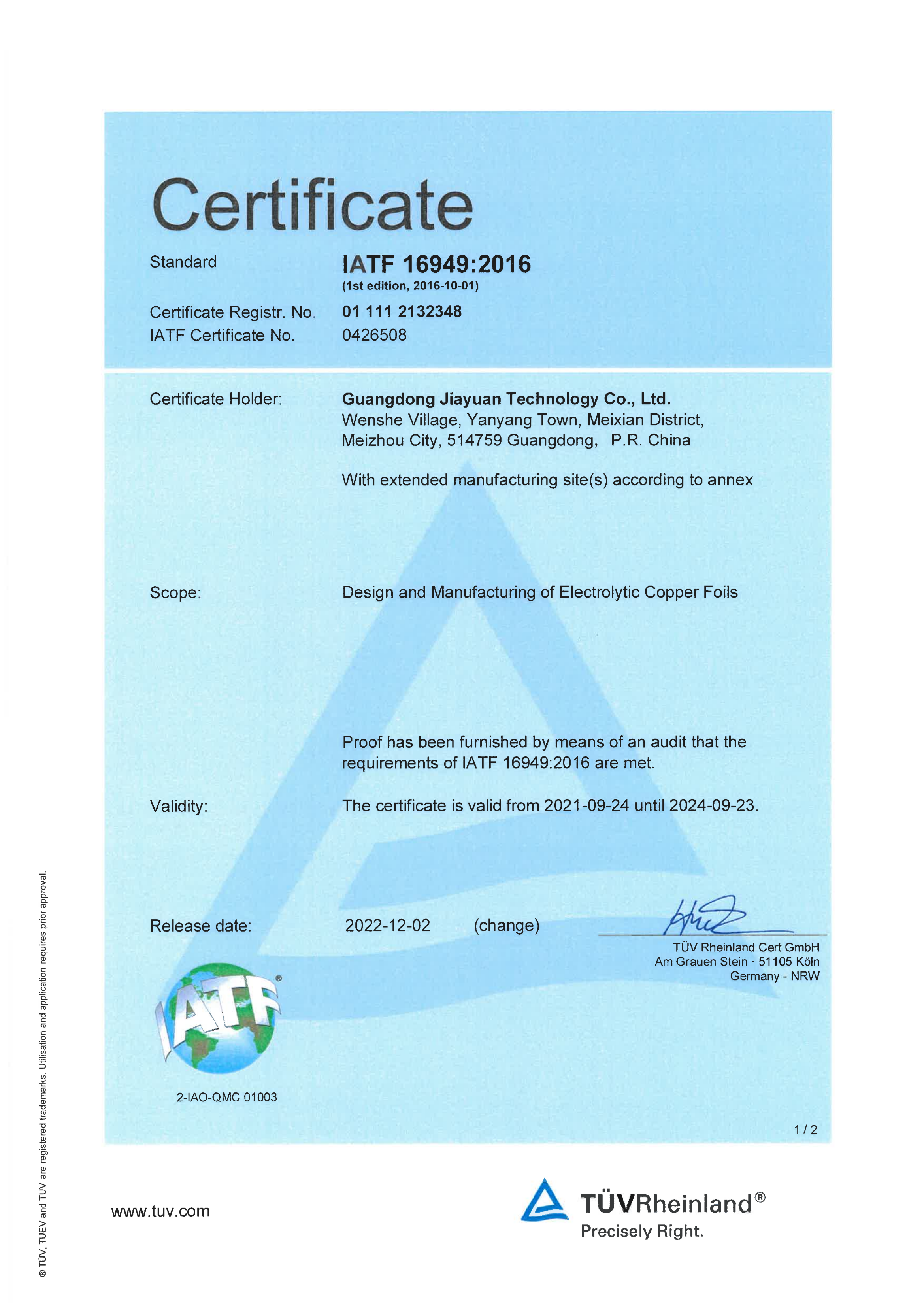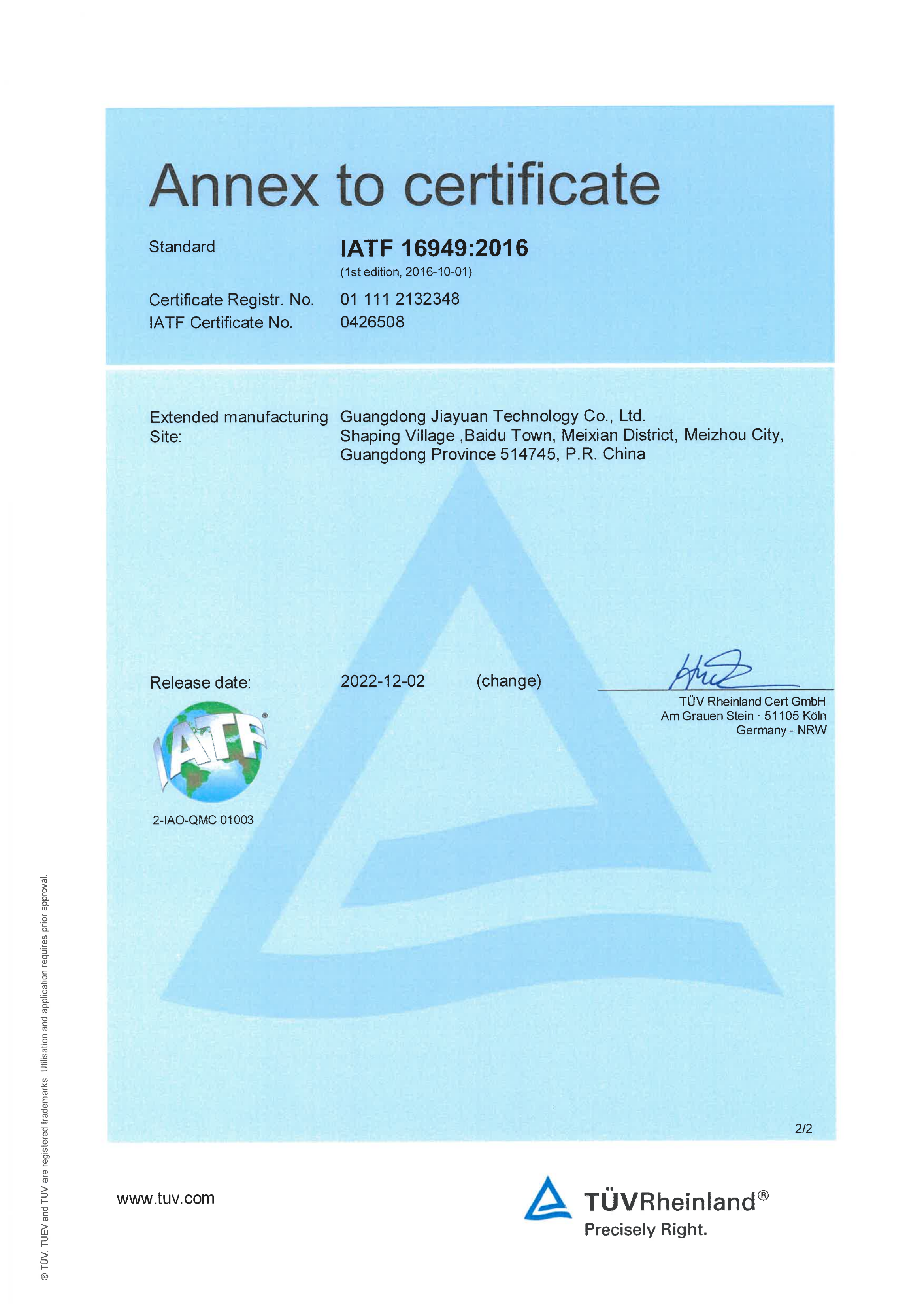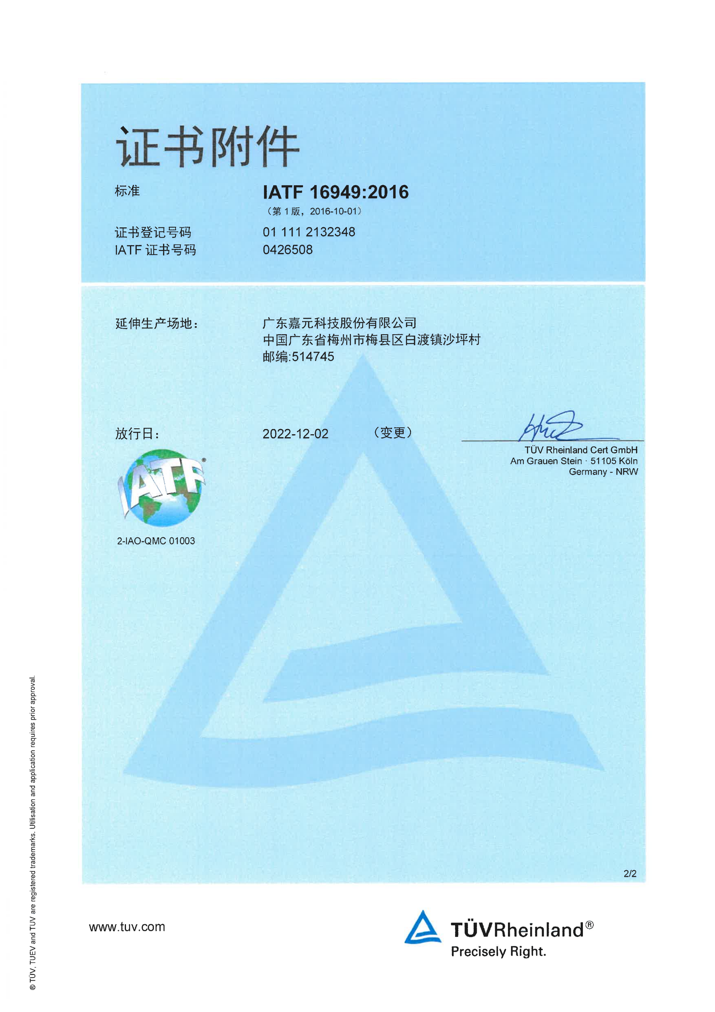 IATF 16949:2016認(rèn)證證書